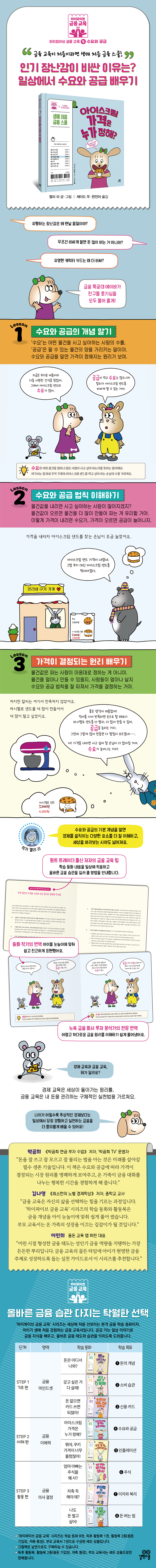 《아이스크림 가격은 누가 정해?》는 세상에 처음 선보이는 본격 금융 학습 시리즈 ‘하이파이브 금융 교육’ 의 네 번째 책입니다. 동물 마을 금융 특공대 에이바, 행크, 찰리가 수요와 공급 법칙에 따라 가격이 결정되는 원리를 쉽고 재미있게 설명합니다.