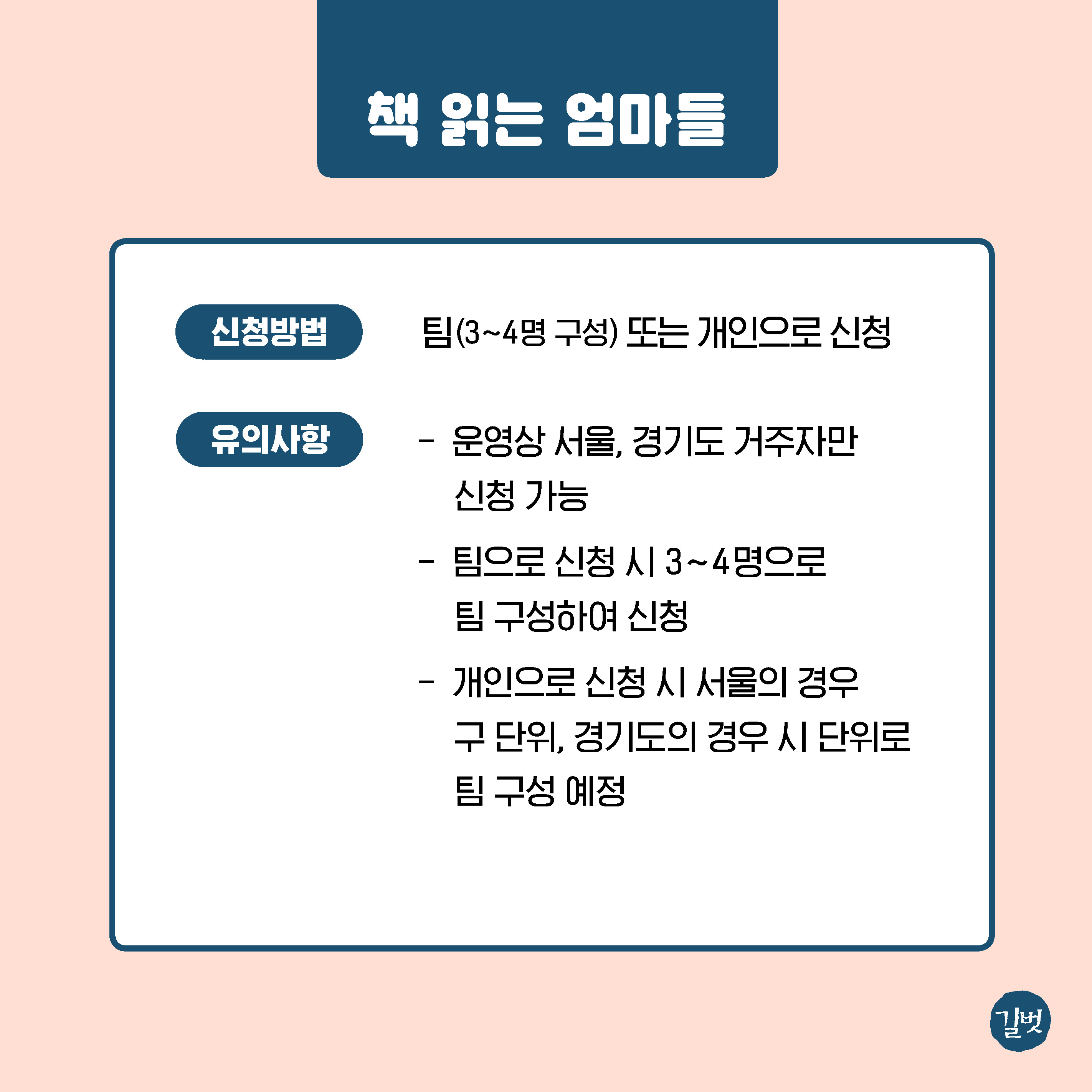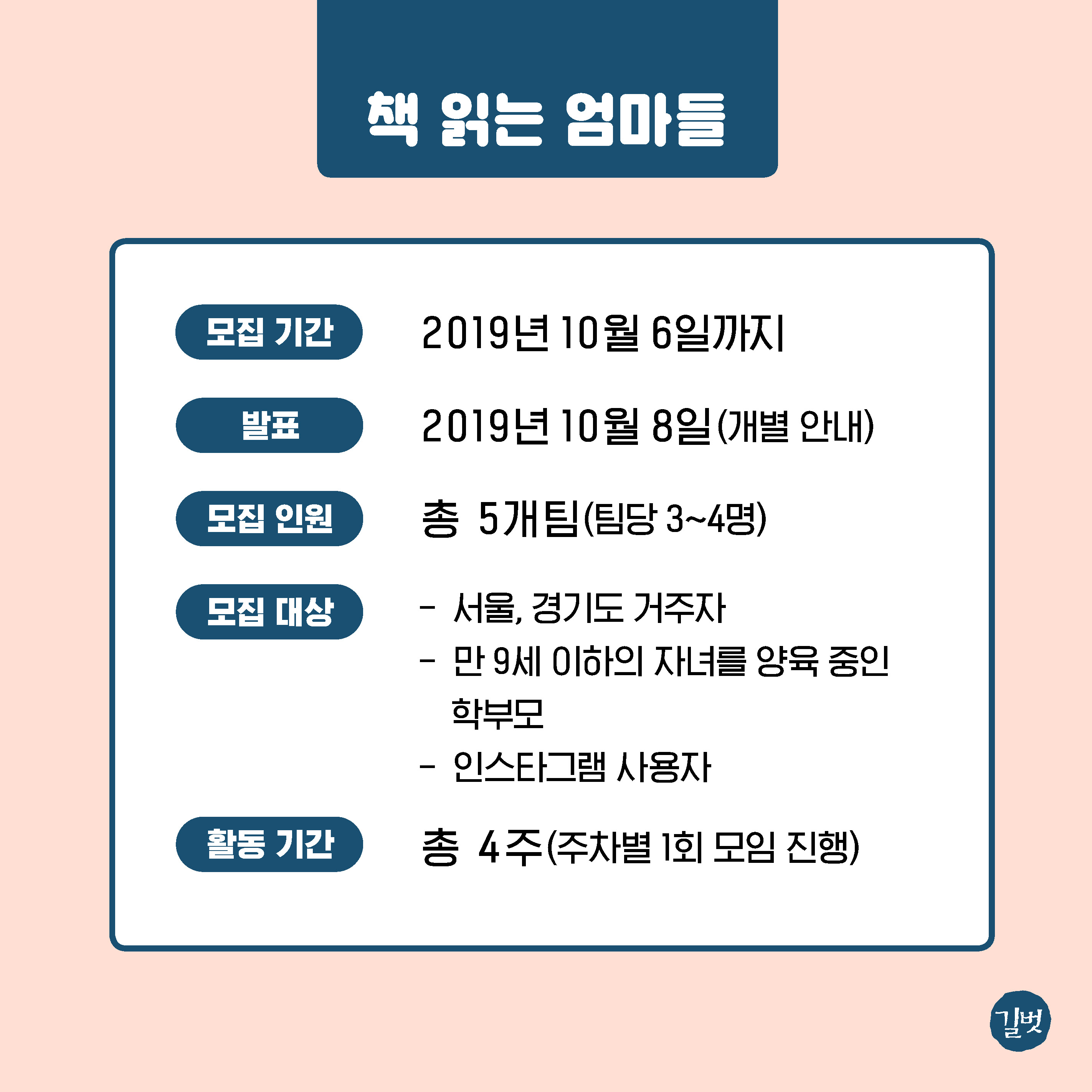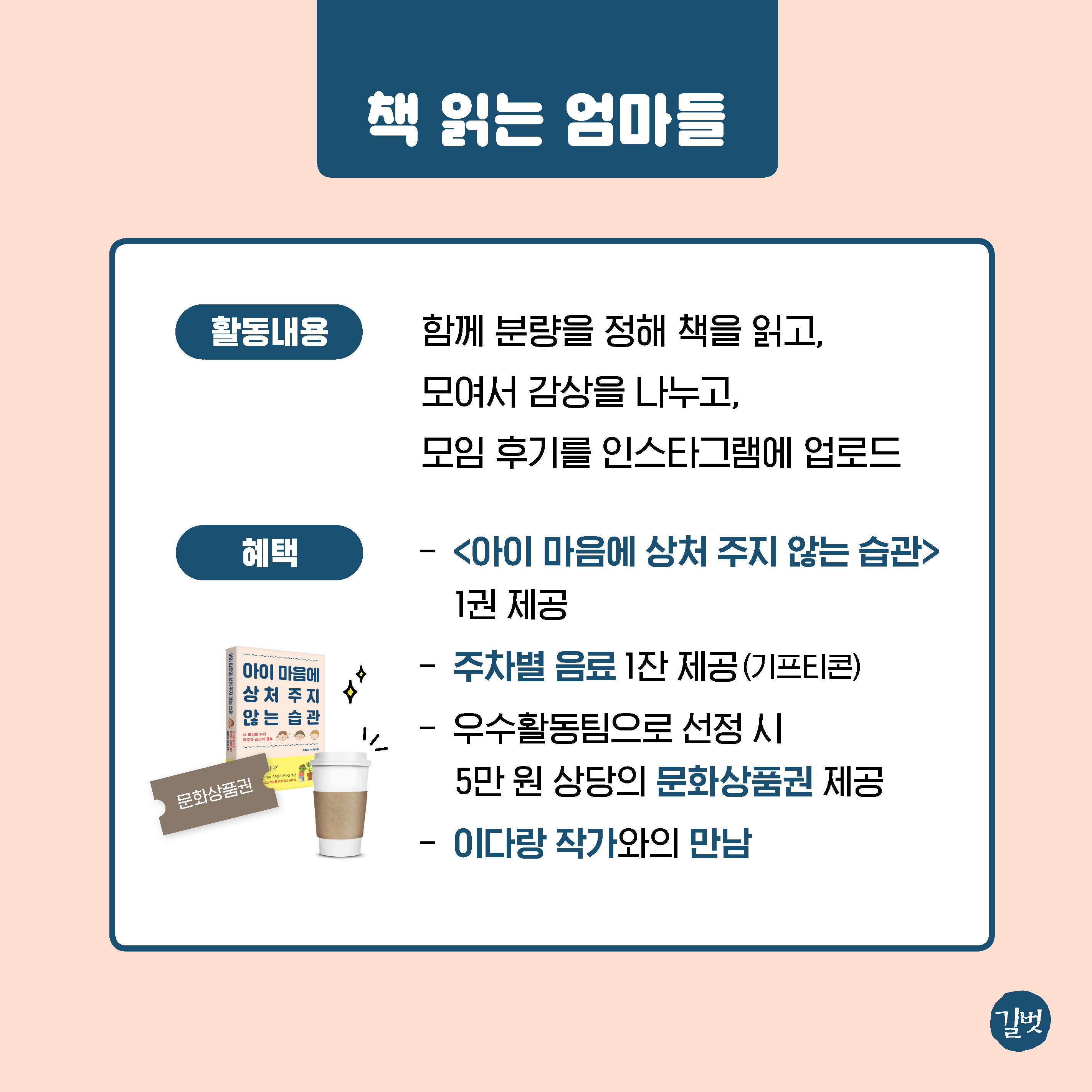 고객센터 FAQ 1:1 문의 · 나의 문의/답변 포인트 도서 신청 기적의 학습단 교재, 저자 · 교수, 강사 자료 · 전국 총판 안내 · 저자 모집 이벤트, 설문, 모집 공지사항 이벤트, 설문, 모집 '책 읽는 엄마들' 1기 모집 참여기간 2019.09.30 ~ 2019.10.06 등록일 2019.09.30 > 팀 신청하기 > 개인 신청하기 목록 로그인 후 댓글을 남길 수 있습니다. 댓글등록 이전글 길벗스쿨 무료 학습 자료 모음 다음글 길벗스쿨 2020 1학기 기적의 학습단 추가 모집