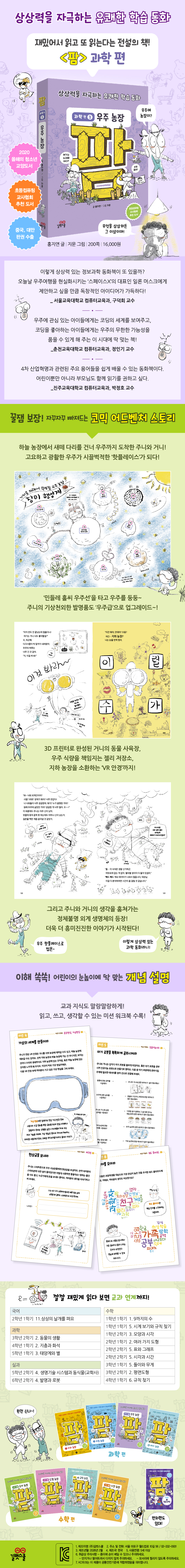《팜 과학편 4: 우주 농장》에서는 우주로 배경을 옮겨 더욱 스펙터클한 이야기가 펼쳐집니다. 9개의 행성을 관리해 주는 ‘연결해, 책책!’, 우주를 둥둥 떠다니는 ‘민들레 홀씨 우주선’, 어디든 쭉 뽑아서 연결할 수 있는 ‘만능 사다리’, 가상 현실로 안내하는 ‘VR 안경’ 등 주니의 발명품도 ‘우주급’으로 업그레이드되고 갑자기 AI 로봇의 아빠가 된 거니는 육아를 하느라 정신이 없습니다. 여기에 정체불명의 외계 생명체와 우주 사냥꾼이 등장하여 긴장감을 더하는데요. 과연 이번엔 사냥꾼의 정체를 밝힐 수 있을까요?
